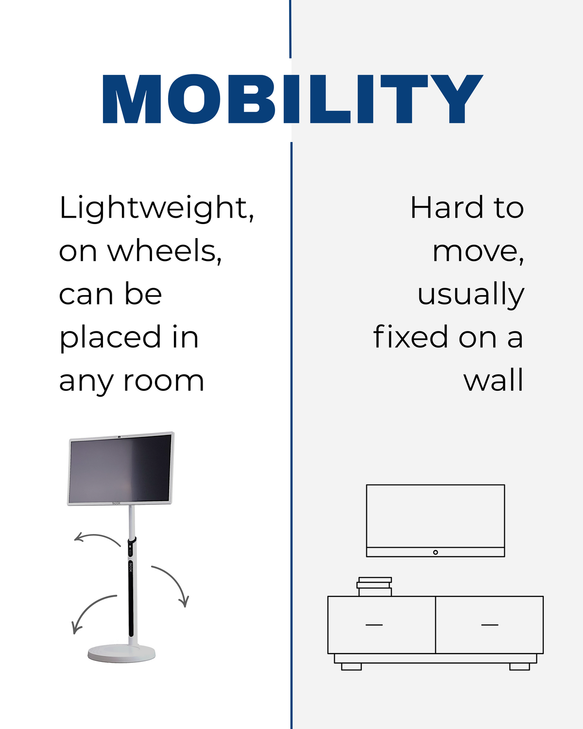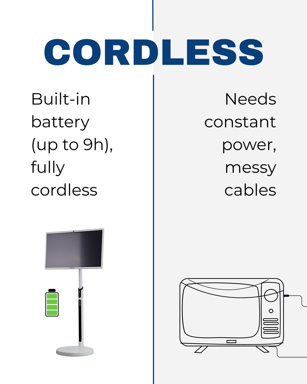 The SIDEK iTV features a 192.4Wh built-in battery with an indicator light, a powerful speaker, and an easy power button. Its rollable stand ensures effortless mobility, perfect for any space.