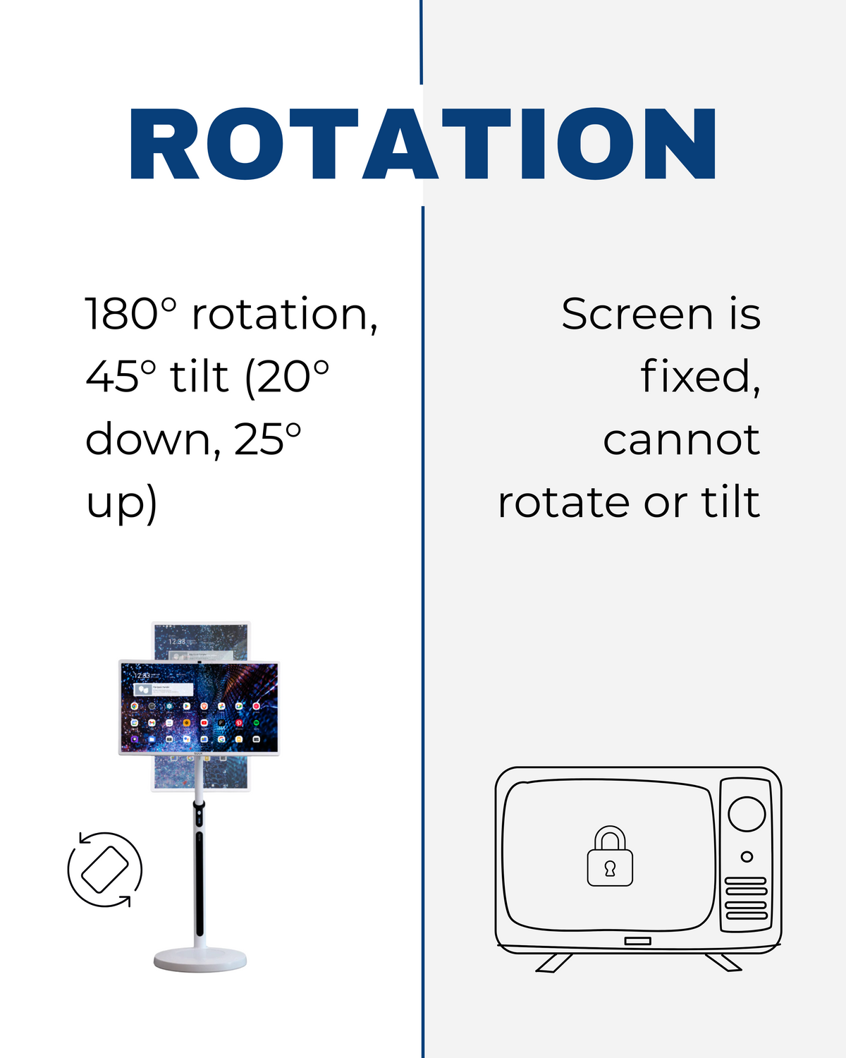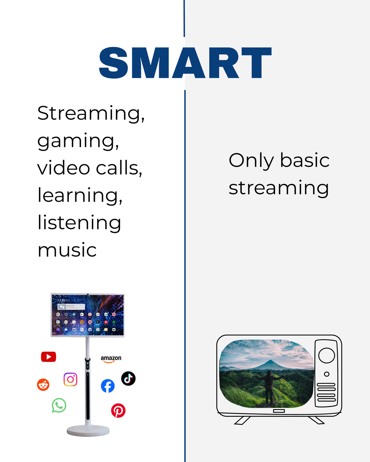 The Rotatable Smart iTV with 6GB RAM, powered by the MTK8788 processor, delivers smooth performance for gaming, streaming HD movies, video calls, and online meetings without lag. With high-speed multitasking capabilities, you can seamlessly run multiple apps, learn with educational tools, or enjoy real-time sports tracking. Its portable, rolling design makes it perfect for any room, and with easy setup, it's ready to use right out of the box!
